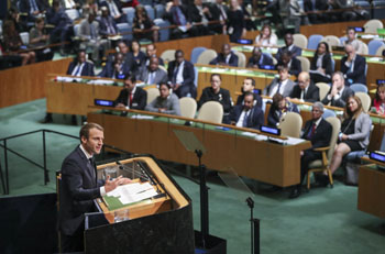 ??? 9月19日,在紐約聯(lián)合國總部,法國總統(tǒng)馬克龍在聯(lián)大一般性辯論上發(fā)言。第72屆聯(lián)合國大會一般性辯論19日在紐約聯(lián)合國總部開始舉行。記者 王迎 攝 |