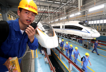 ??? 9月19日,技術保障人員進入上海虹橋“復興號”動車檢修庫進行相關作業(yè)。21日起,“復興號”動車組在京滬高鐵提速至350公里時速運行。記者 陳飛 攝 |