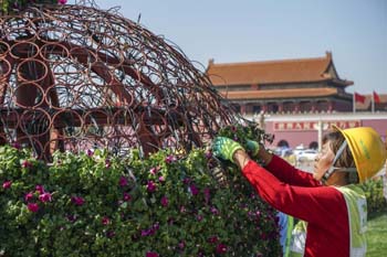 ??? 9月18日,工作人員在天安門廣場布置花卉。當日,天安門廣場國慶花卉布置工作開始。據(jù)介紹,國慶期間天安門廣場中心將布置“祝福祖國”巨型花籃,東西長安街將各擺放7組花壇。記者 殷剛 攝 |