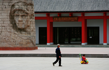 ??? 圖為紅軍強(qiáng)渡大渡河紀(jì)念館外,一名老人帶著孩子在經(jīng)過(guò)。(四川省旅游發(fā)展委員會(huì)供圖) |