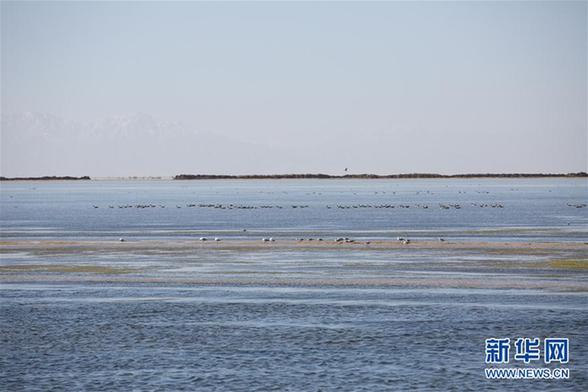 鳥兒在青海察爾汗鹽湖邊的淡水湖上棲息(9月10日攝)。新華社記者 金立旺 攝