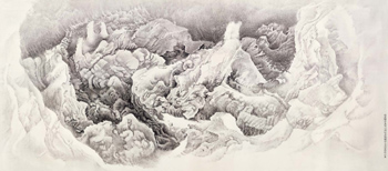 此次這件《山原的凝視》,正是受讓·奧古斯特·多米尼克·安格爾的名作《露易斯·奧松維爾夫人》的啟發(fā),畫(huà)中夫人的眼神引起了劉丹的注意與無(wú)限的遐想,她瞳孔中的深邃透閃著神秘的光芒,充滿了無(wú)法捉摸的可能,正是在這迷人的眼神之中,劉丹的心中閃現(xiàn)出了一脈奇幻的山原。藝術(shù)家將古今中西的經(jīng)緯彌合在了一仁瞳孔之中,他讓我們?cè)趭W松維爾夫人的凝視中看見(jiàn)了另一個(gè)維度中的山原川澤。
