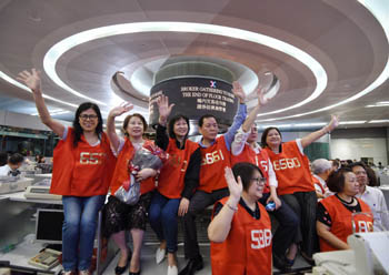 ??? 隨著香港交易所10月27日收市鈴聲響起,最后兩位穿紅馬甲的交易員結(jié)束交易,準(zhǔn)備收拾辦公用品離開(kāi)。自此,香港證券業(yè)在交易大堂內(nèi)進(jìn)行交易的時(shí)代畫(huà)上圓滿句號(hào)。圖為身穿紅馬甲的交易員在揮手告別。新華社發(fā)(王申 攝) |
