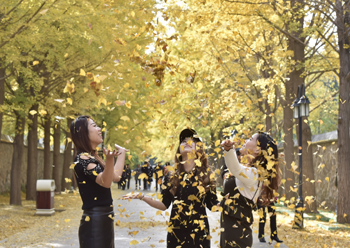 ??? 10月31日,游客在圓明園銀杏大道游玩。北京圓明園內(nèi)有一條近千米的銀杏大道,目前已進(jìn)入最佳觀賞期,黃燦燦的銀杏葉和兩側(cè)圍墻上紅色的藤蔓相互映襯,美不勝收,吸引游客前來(lái)觀賞。記者 羅曉光 攝 |