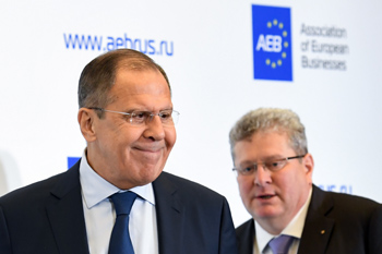??? 10月31日,在俄羅斯莫斯科,俄羅斯外交部長(zhǎng)拉夫羅夫(左)出席駐俄歐洲企業(yè)協(xié)會(huì)成員代表參加的會(huì)議。拉夫羅夫當(dāng)日于此表示,俄方希望與歐盟開(kāi)展更多經(jīng)貿(mào)往來(lái),共同推進(jìn)歐亞一體化進(jìn)程。新華社/法新 |