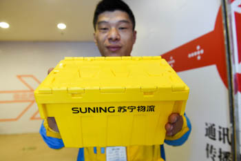 ??? 10月31日,江蘇南京蘇寧云倉(cāng)物流基地工作人員展示“共享快遞盒”。據(jù)首家使用和推廣“共享快遞盒”的蘇寧易購(gòu)介紹,電商物流將智能包裝和末端服務(wù)相結(jié)合,采用可循環(huán)的特制快遞包裝盒代替?zhèn)鹘y(tǒng)常用紙箱,每個(gè)特制快遞盒成本25元,可循環(huán)使用1000余次。記者 李博 攝 |
