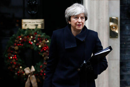 ??? 12月11日,在英國倫敦,英國首相特雷莎·梅走出唐寧街10號首相府。特雷莎·梅11日說,英國預計向歐盟支付350億至390億英鎊(約合470億至520億美元)的“脫歐分手費”,但條件是雙方未來要達成一份貿易協(xié)議。新華社/法新