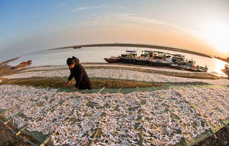 ??? 12月8日,在江西鄱陽湖都昌印山附近湖灘,漁民在晾曬鳳尾魚干。連日來,江西鄱陽湖畔魚干飄香。漁民將捕獲的鳳尾魚晾曬,加工成魚干供應各地市場。新華社發(fā)(傅建斌 攝)