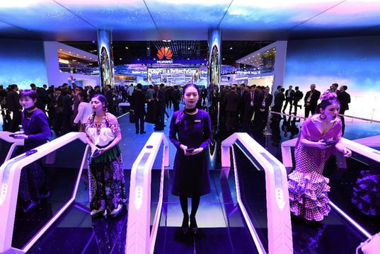 為期四天的2018年世界移動(dòng)通信大會(huì)2月26日在巴塞羅那開(kāi)幕。圖為當(dāng)日,人們?cè)谖靼嘌腊腿_那舉行的世界移動(dòng)通信大會(huì)上參觀華為公司展臺(tái)。新華社記者 郭求達(dá) 攝
