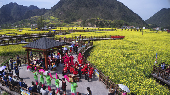 漢中市勉縣老年大學的學員們在唐家灣油菜花觀光點為旅游者表演節(jié)目。
