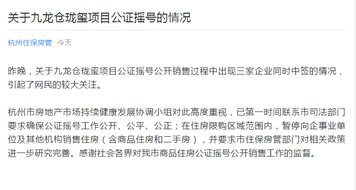 杭州住保房管公眾號(hào)26日發(fā)布消息稱(chēng),25日晚,關(guān)于九龍倉(cāng)瓏璽項(xiàng)目公證搖號(hào)公開(kāi)銷(xiāo)售過(guò)程中出現(xiàn)三家企業(yè)同時(shí)中簽的情況,引起了網(wǎng)民的較大關(guān)注。