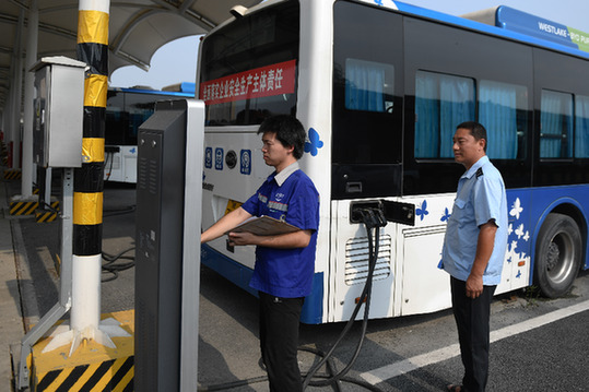 行駛中無尾氣排放,實現(xiàn)“零排放、零污染”的純電動公交車已成為杭州的一道亮麗風景線。記者 黃宗治 攝