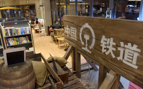 蚌埠新華書店延安路店采用中國鐵路元素和鐵道周邊文化為主題裝修,展現(xiàn)了蚌埠這座“火車?yán)瓉淼某鞘小豹毺氐臍v史畫面,營造懷舊、舒適的讀書環(huán)境,受到市民青睞。記者 郭晨 攝?