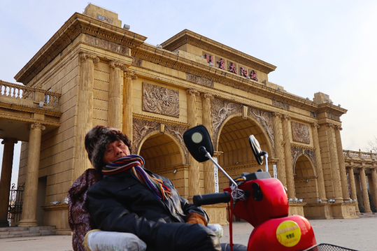 1月18日,在北京太陽(yáng)城國(guó)際養(yǎng)老公寓大門前的廣場(chǎng)上,一位老人坐在代步車上曬太陽(yáng)。記者 張小潔 攝