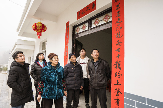 圖為搬遷到扶貧安置小區(qū)的吳邦桂(左三)老人一家六口在新居門口看剛貼上的春聯(lián)。