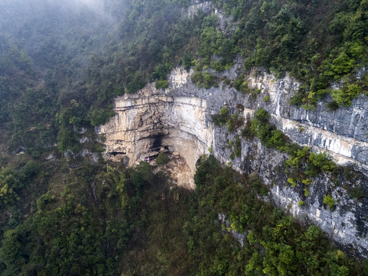 上圖為湖北建始縣景陽鎮(zhèn)偏坦村五組吳邦桂老人在絕壁下的崖居外景。