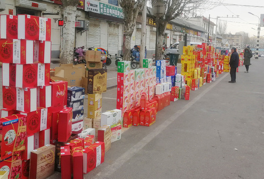 2月7日,內(nèi)蒙古巴彥淖爾市臨河區(qū)雙河鎮(zhèn)先鋒橋北,披著華麗外衣的山寨牛奶,混在各種高檔禮盒中。記者 王靖 攝