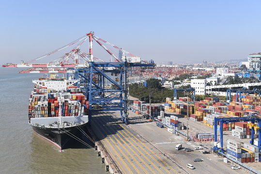 廈門嵩嶼集裝箱碼頭裝箱吊裝現(xiàn)場(chǎng)。記者 林善傳 攝