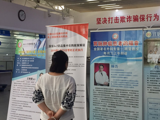 北京大學(xué)首鋼醫(yī)院門(mén)診部大廳內(nèi)的“4+7”政策宣傳展板/ 鄧睿攝
