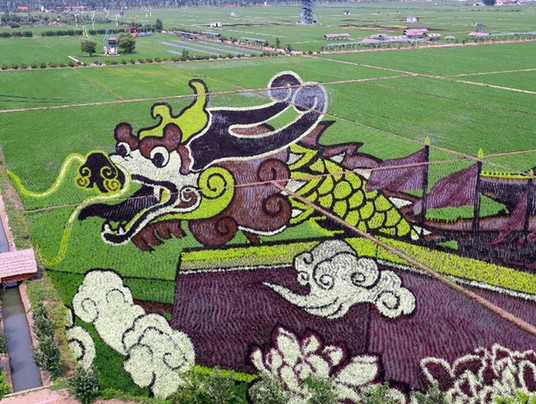 沈陽興隆臺錫伯族鎮(zhèn)錫伯龍地創(chuàng)意農(nóng)業(yè)產(chǎn)業(yè)園的稻田畫《我愛你中國》。記者 楊青 攝