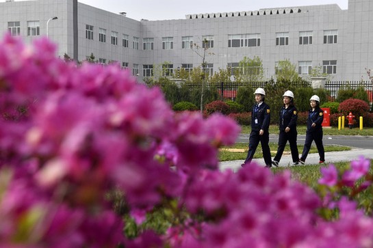 在萬華煙臺工業(yè)園,工作人員自覺“三人成列”(2019年4月30日攝)。記者 郭緒雷 攝