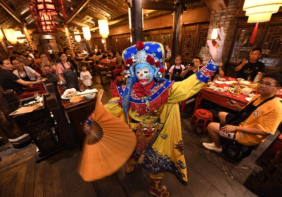 話音剛落,只聽火鍋店的天井里響起了悠揚的二胡聲,聞聲望去,一位古裝女琴師正在一方露天舞臺中間傾情表演。食客們紛紛起身,很快圍攏過去。接下來的半個小時內(nèi),舞蹈、說唱、舞龍、變臉、工夫茶等戲碼紛紛登場,四川特色十足,演員與食客熱情互動,引得眾人頻頻鼓掌叫好。
