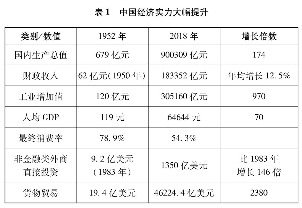 經(jīng)濟實力顯著增強。從1952年至2018年,中國工業(yè)增加值從120億元增加到305160億元,按不變價格計算增長970倍,年均增長11%;國內(nèi)生產(chǎn)總值從679億元增加到90萬億元,按不變價計算增長174倍,年均增長8.1%;人均國內(nèi)生產(chǎn)總值從119元增加到2018年的64644元,按不變價計算增長70倍。根據(jù)世界銀行數(shù)據(jù),按市場匯率計算,2018年中國經(jīng)濟規(guī)模為13.6萬億美元,僅次于美國的20.5萬億美元。目前,中國是世界上唯一擁有聯(lián)合國產(chǎn)業(yè)分類目錄中所有工業(yè)門類的國家,多項工業(yè)品產(chǎn)量居世界第一??萍及l(fā)展成就顯著,“兩彈一星”、載人航天、超級雜交水稻、高性能計算機、人工合成牛胰島素、青蒿素、高速鐵路等重大科技成果,為經(jīng)濟社會發(fā)展提供了有力支撐。對外貿(mào)易持續(xù)增加,2009年中國成為全球最大貨物出口國、第二大貨物進(jìn)口國,2013年成為全球貨物貿(mào)易第一大國。改革開放以來,中國引進(jìn)外資大幅增加,日益成為吸引全球投資熱土。中國已經(jīng)成為世界第二大經(jīng)濟體、制造業(yè)第一大國、貨物貿(mào)易第一大國、商品消費第二大國、外資流入第二大國、外匯儲備第一大國(表1)。