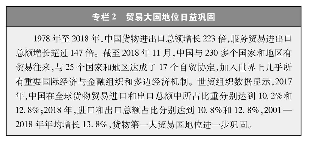 大規(guī)?!罢堖M(jìn)來”。打開大門的中國充滿生機與活力,國際社會看好中國發(fā)展,越來越多的國家與中國開展合作,越來越多的外國企業(yè)來中國投資興業(yè),越來越多的外國人士來中國學(xué)習(xí)工作、觀光旅游。1978年至2018年,中國累計吸引非金融類外商直接投資20343億美元,累計設(shè)立近100萬家外商投資企業(yè)。2018年,有49.2萬余名外國留學(xué)人員來華學(xué)習(xí)。加入世界貿(mào)易組織后,中國參與經(jīng)濟全球化提質(zhì)增速(專欄2)。2001年至2018年,中國貨物貿(mào)易進(jìn)口額從2436億美元增至21358億美元,年均增長13.6%,高于全球平均水平6.8個百分點;服務(wù)貿(mào)易進(jìn)口額從393億美元增至5250億美元,年均增長16.5%,占全球服務(wù)貿(mào)易進(jìn)口總額的9.4%。