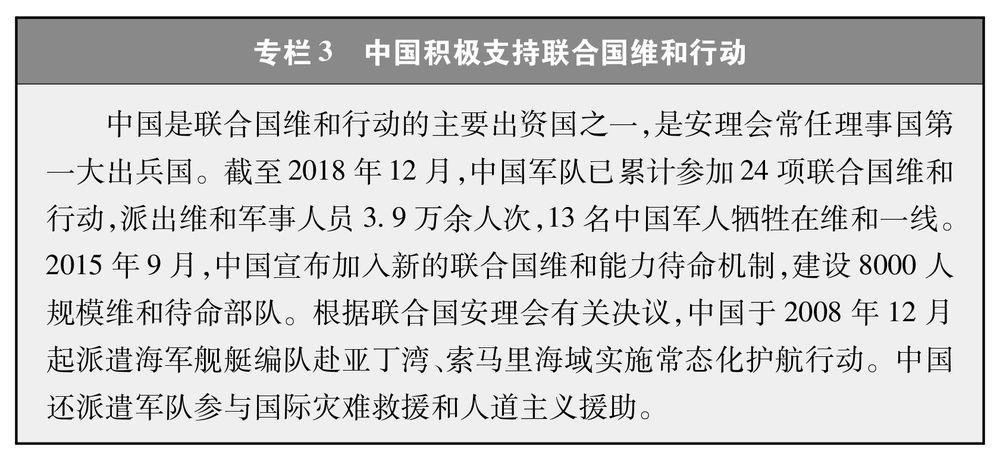 中國以實際行動維護(hù)世界和平。70年來,中國沒有主動挑起過任何一場戰(zhàn)爭和沖突,沒有侵占過別國一寸土地。改革開放以來,中國主動裁減軍隊員額400余萬。中國積極參與國際軍控、裁軍和防擴散進(jìn)程,反對軍備競賽,維護(hù)全球戰(zhàn)略平衡與穩(wěn)定。中國簽署或加入《不擴散核武器條約》等20個多邊軍控、裁軍和防擴散條約。中國已成為聯(lián)合國第二大維和預(yù)算攤款國和經(jīng)常性預(yù)算會費國,是安理會常任理事國第一大出兵國(專欄3)。2015年起,中國宣布設(shè)立為期10年、總額10億美元的中國-聯(lián)合國和平與發(fā)展基金,并于2016年正式投入運行。中國始終致力于通過談判、協(xié)商方式處理領(lǐng)土問題和海洋劃界爭端,同14個鄰國中的12個國家徹底解決了陸地邊界問題,劃定了中越北部灣海上界線,為和平解決國家間歷史遺留問題以及國際爭端開辟了嶄新道路。中國積極參與重大國際和地區(qū)熱點問題解決,發(fā)揮了建設(shè)性作用。