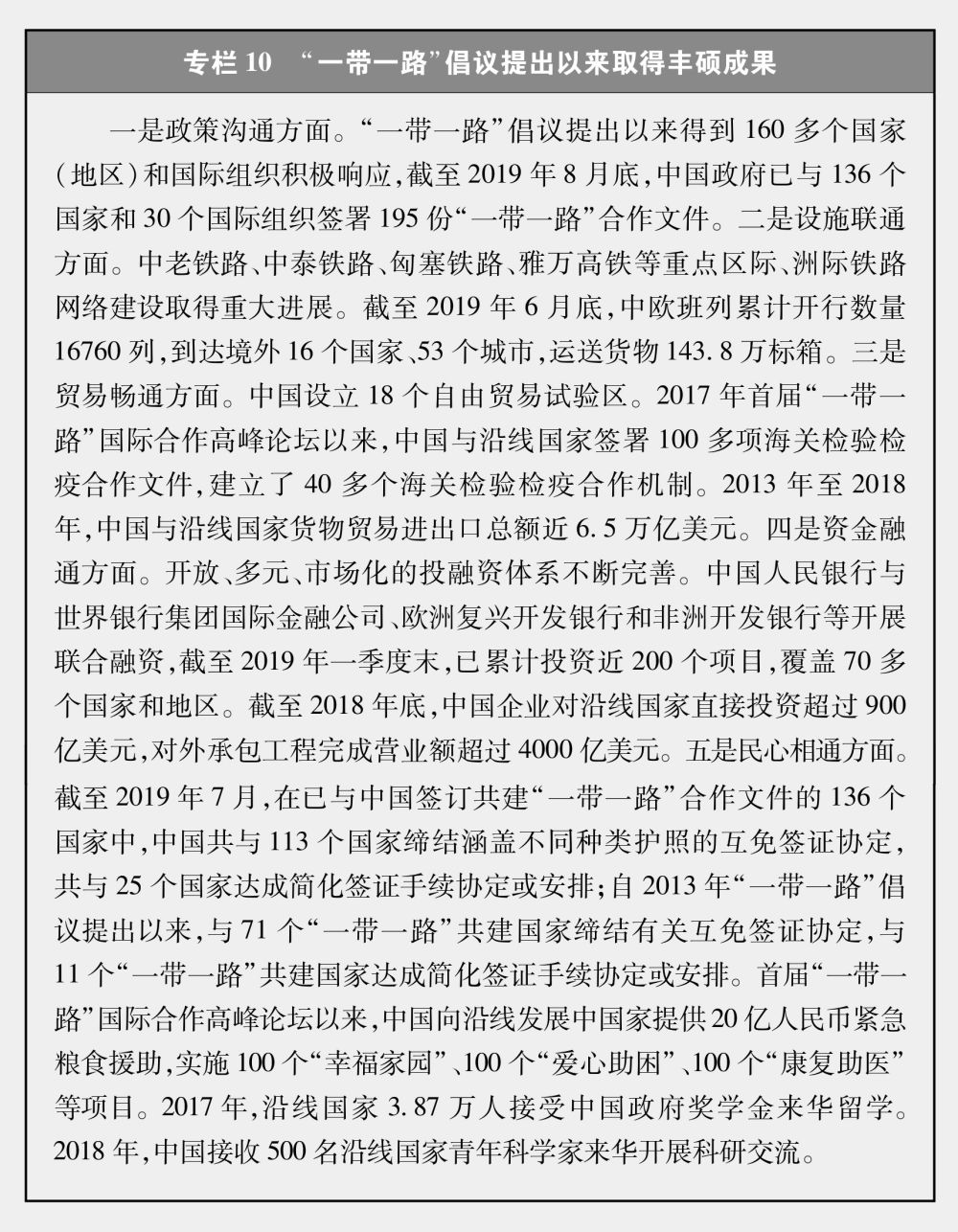 推動高質(zhì)量共建“一帶一路”。共建“一帶一路”倡議以共商共建共享為原則,以和平合作、開放包容、互學(xué)互鑒、互利共贏的絲綢之路精神為指引,以政策溝通、設(shè)施聯(lián)通、貿(mào)易暢通、資金融通、民心相通為重點,已經(jīng)從理念轉(zhuǎn)化為行動,從愿景轉(zhuǎn)化為現(xiàn)實,從倡議轉(zhuǎn)化為全球廣受歡迎的公共產(chǎn)品(專欄10)。2016年11月聯(lián)合國通過決議,歡迎共建“一帶一路”等經(jīng)濟合作倡議。2017年3月,聯(lián)合國安理會決議中呼吁各國推進(jìn)“一帶一路”建設(shè),構(gòu)建人類命運共同體?!耙粠б宦贰背h源于中國,機會和成果屬于世界。據(jù)世界銀行研究報告,“一帶一路”倡議將使相關(guān)國家760萬人擺脫極端貧困、3200萬擺脫中度貧困,將使參與國貿(mào)易增長2.8%至9.7%、全球貿(mào)易增長1.7%至6.2%、全球收入增加0.7%至2.9%。(注8)“一帶一路”倡議是名副其實的資源共享、共同繁榮、共同發(fā)展之路。
