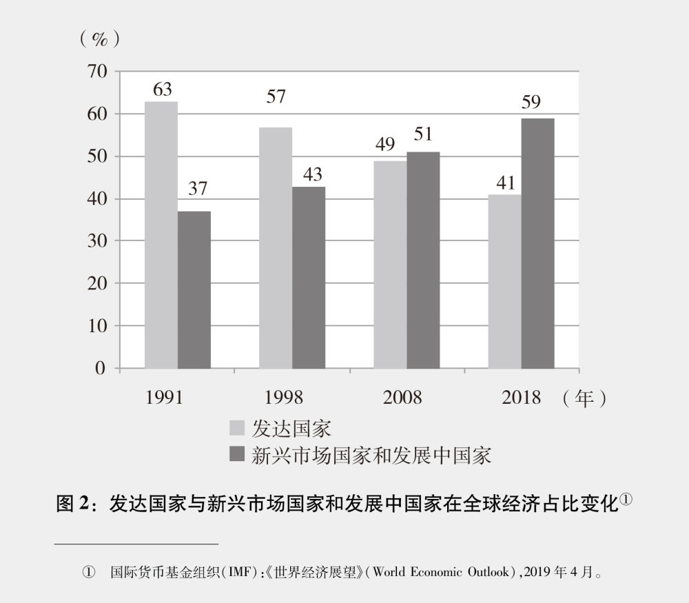 ↑圖表:圖2:發(fā)達(dá)國家與新興市場國家和發(fā)展中國家在全球經(jīng)濟占比變化① 新華社發(fā)