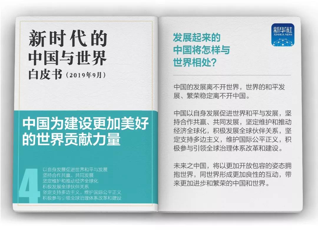 當(dāng)前,中國發(fā)展進(jìn)入了新時代。白皮書指出,新時代的中國,走中國特色社會主義道路的決心不會改變,與其他國家互學(xué)互鑒、合作共贏的決心不會改變,與世界攜手同行的決心不會改變。未來之中國,將以更加開放包容的姿態(tài)擁抱世界,同世界形成更加良性的互動,帶來更加進(jìn)步和繁榮的中國和世界。