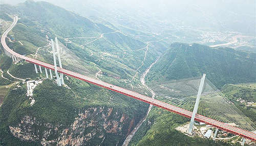 跨越云貴邊界,2016年底開通的北盤江大橋全長1341米,似一道彩虹橫跨在峽谷之上,橋面至江面距離565米,近200層樓的高度標記著世界第一高橋的奇跡。
