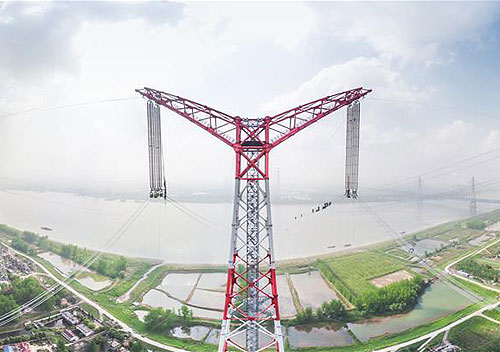 這是西電東送±1100千伏“新疆準東—安徽皖南”特高壓直流工程位于長江北岸的跨越塔(2018年4月15日無人機拍攝)。新華社記者 郭晨 攝