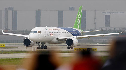 中國首款國際主流水準的干線客機C919在上海浦東國際機場首飛成功(2017年5月5日攝)。新華社記者 方喆 攝