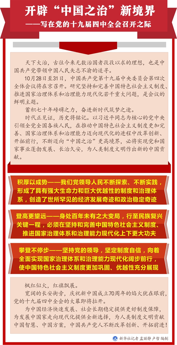 ??? 新華社北京10月27日電 題:開辟“中國之治”新境界——寫在黨的十九屆四中全會召開之際