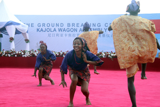 中國(guó)土木工程集團(tuán)有限公司(中土集團(tuán))投資建設(shè)的尼日利亞首個(gè)鐵路車輛組裝廠9日在尼西南部奧貢州卡焦拉鎮(zhèn)舉行奠基儀式。圖為在尼日利亞奧貢州卡焦拉鎮(zhèn),當(dāng)?shù)匮輪T在奠基儀式上表演傳統(tǒng)舞蹈。