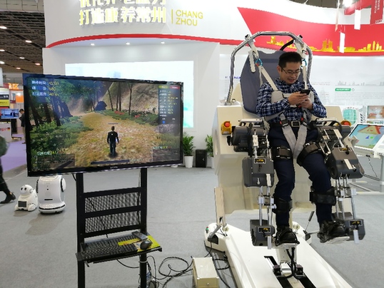 江蘇常州一家公司的康復(fù)訓(xùn)練產(chǎn)品,亮相2019江蘇國際養(yǎng)老服務(wù)業(yè)博覽會。(新華社發(fā))