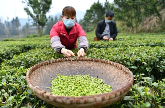 由于冬暖明顯,2月5日起,浙南溫州、麗水等地“烏牛早”春茶已陸續(xù)開采,較常年提早大約1周時間。在麗水市縉云縣胡源鄉(xiāng),8000多畝的茶樹已萌發(fā)新芽。一大早,茶農(nóng)們就戴上口罩,在茶園里忙碌了起來?!澳懿烧嗌偈嵌嗌伲巡枨嗉庸こ筛刹枞~放起來,等疫情過去可以拿到市場上賣?!辈柁r(nóng)胡愛仙說。