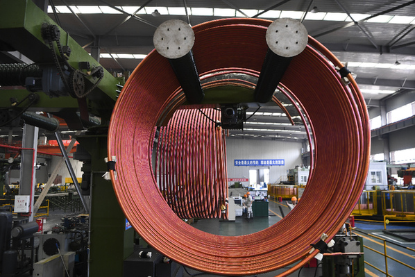 機器轟鳴聲中,一塊塊銅板仿佛被施了魔法,依次進(jìn)入一臺臺機器中,經(jīng)過熔鑄、軋制、聯(lián)拉、退火等復(fù)雜工序,最后一臺“大塊頭”聽話地不斷“吐出”不同規(guī)格的精密銅管。