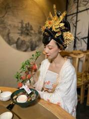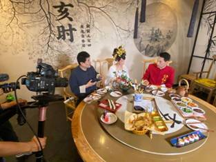 直播中,當(dāng)一桌子“網(wǎng)紅”菜品上桌后,直播間的觀看熱度逐漸升溫?!耙或T紅塵妃子笑,無(wú)人知是荔枝來(lái)”,蝦肉特制的“妃子笑”讓大家垂涎三尺,看到佳晨吃這道菜,仿佛穿越到唐朝看楊貴妃在品嘗荔枝。而靈感來(lái)源于古代文房四寶的“毛筆酥”也引起了網(wǎng)友的關(guān)注,佳晨拿起毛筆,蘸上一口藍(lán)莓醬搭配紅糖的“墨汁”,網(wǎng)友直呼“吃的都是文化啊”。