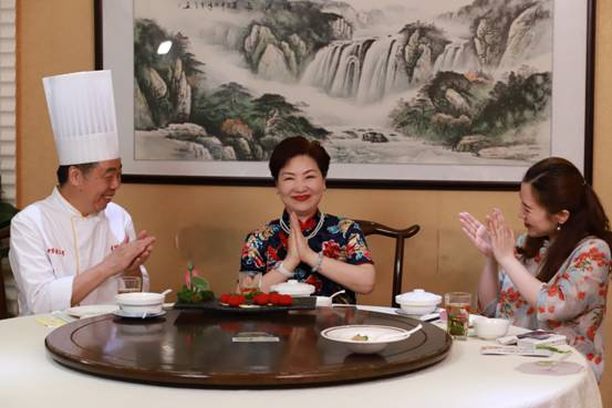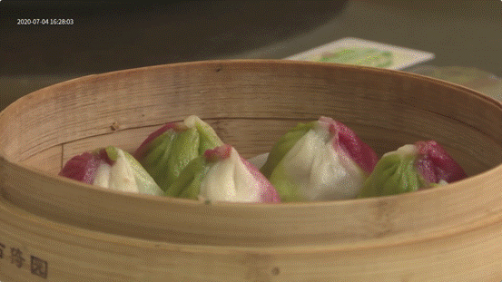 游園環(huán)節(jié)之后,主持人來(lái)到了園林旁邊的上海古猗園餐廳。著名說(shuō)唱演員、國(guó)家一級(jí)演員顧竹君老師已在餐廳等候。在李建鋼師傅的招待下,顧竹君和主持人一道品嘗了傳統(tǒng)小籠和多種色彩繽紛的創(chuàng)新小籠?;瘕埞{(diào)為紅色,菠菜調(diào)為綠色,蓮藕、黃瓜紛紛入餡……歷史悠久的南翔小籠正在不斷創(chuàng)新。