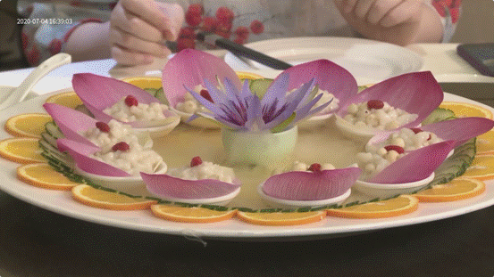 此時(shí)正值古猗園舉辦荷花展,餐廳推出了飽含荷花元素的“荷花宴”。“楊梅時(shí)節(jié)”“雙魚(yú)戲荷”“秋葵大黃魚(yú)”“金湯芙蓉球”“蓮花魚(yú)米盞”等幾道菜肴被端至嘉賓面前。先于味覺(jué)感受的是視覺(jué)美,幾道菜肴引得直播間的網(wǎng)友大流口水。在品嘗菜肴的間隙,節(jié)目還“混搭”了一款雪糕——頗具人氣的“鐘薛高”。鐘薛高是來(lái)自南翔的企業(yè)之一,其瓦片狀的外形極具中式美,精選原料制成的雪糕讓這家創(chuàng)立于2018年的企業(yè)快速成長(zhǎng)為“新國(guó)潮”。