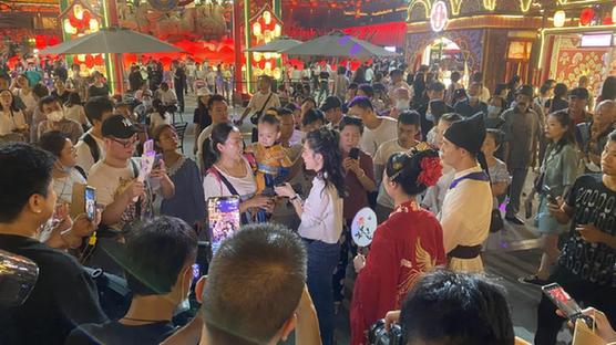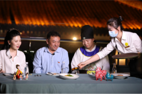 直播當(dāng)日,在如畫卷般的長安夜色中,主持人和大唐不夜城“唐妞”、曲江文旅“李白”一起漫步大唐不夜城,探訪“盛世長安”的人間煙火。在“唐食坊”內(nèi),主持人和嘉賓走街串店,品嘗了團(tuán)扇酥、杏酪酥、貴妃稠酒、長安冰酪等原汁原味的唐朝美食,還為大家介紹了唐代的禮儀與風(fēng)俗。文創(chuàng)產(chǎn)品“長安冰酪”的亮相引發(fā)網(wǎng)友熱議,“大雁塔”和“唐仕女”造型的創(chuàng)意冰激凌,由身穿古代服飾的“店小二”遞到手里,瞬間就有了穿越唐朝的感覺。除了美食之外,在大唐不夜城街區(qū)上還有“真人不倒翁”“武士雕刻”“懸浮李白”等藝術(shù)表演。歷史和現(xiàn)代交相呼應(yīng),文化和潮流完美碰撞,讓大家宛如踏入盛唐繁華的都市勝景。