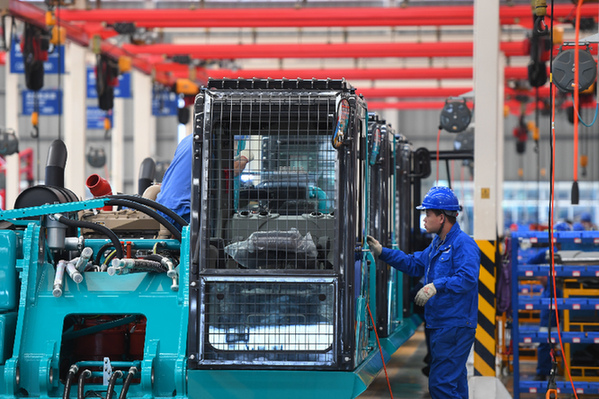 在位于湖南省長沙經開區(qū)的山河智能裝備股份有限公司,工作人員在中型挖機裝配車間作業(yè)。