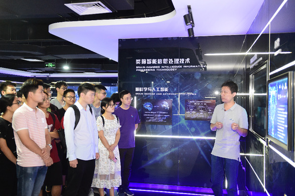 中國(guó)科學(xué)技術(shù)大學(xué)的學(xué)生在類腦智能技術(shù)及應(yīng)用國(guó)家工程實(shí)驗(yàn)室展廳內(nèi)參觀。記者 黃博涵 攝