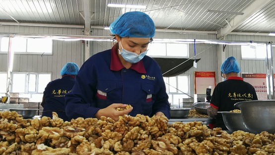 深圳援疆前指還協(xié)助光華現(xiàn)代農(nóng)業(yè)公司開拓俄羅斯、土耳其等市場,通過中歐班列出口喀什核桃產(chǎn)品,帶動了5000多種植戶脫貧增收。光華公司也把核桃等特色農(nóng)副產(chǎn)品深加工的衛(wèi)星工廠,設(shè)到喀什鄉(xiāng)村的田間地頭,吸納了上百名農(nóng)村婦女務(wù)工。布阿提柯木·買買提告訴記者,她在核桃加工廠工作兩年了,每個月都有一兩千元收入,既能掙錢又不耽誤照顧老人孩子和家務(wù),特別開心。