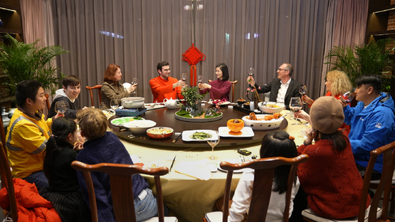 在武漢生活多年的外國人克萊因、海龍、高佑思,春節(jié)期間在武漢與雷神山、火神山醫(yī)院建設(shè)者,外賣小哥等共同慶祝新年。記者 熊琦 攝
