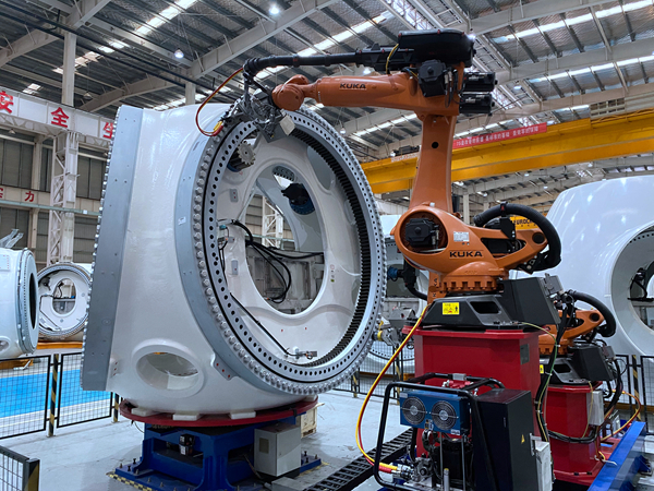浙江省機(jī)電集團(tuán)所屬運達(dá)風(fēng)電裝配車間里,機(jī)器人正在進(jìn)行緊固變槳軸承螺栓作業(yè)。資料照片