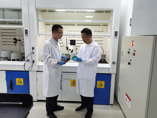 博創(chuàng)宏遠(yuǎn)新材料有限公司負(fù)責(zé)人趙杰博士(右)正在做鋰電正極材料研發(fā)實(shí)驗(yàn)。(資料照片)
